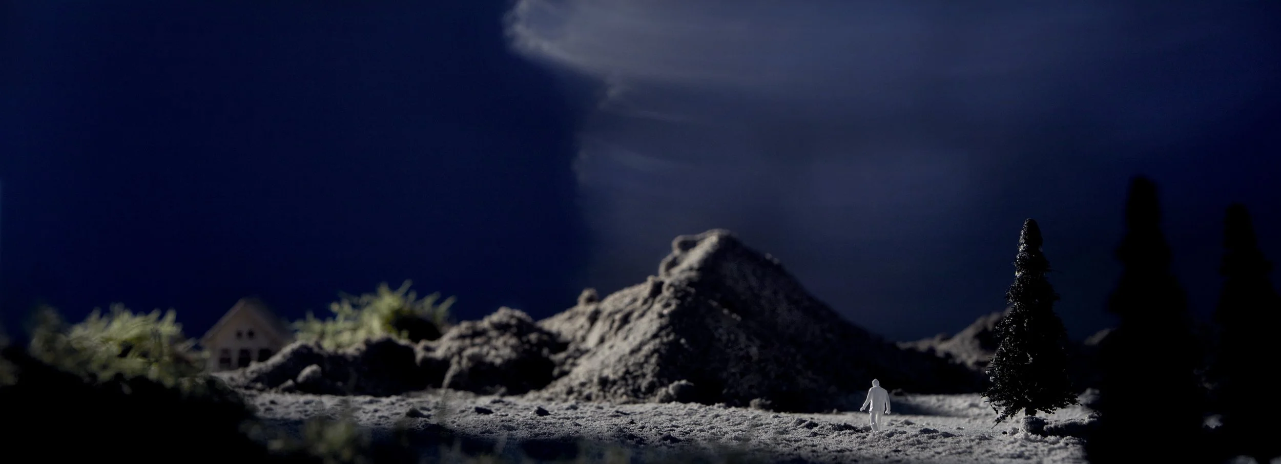 It all begins with an idea. A small idea: Eddy Frings, my stylist and art director, brings that initial spark to the studio. From there we refine the concept, working with available props, arranging elements and building a set — gradually shaping and bringing the idea to life with careful adjustments and deliberate choices. This time he had an idea of dystopian film stills set in an imaginary world, populated with Russian wood toy houses and tiny figurines that hint at a larger, uncanny narrative.